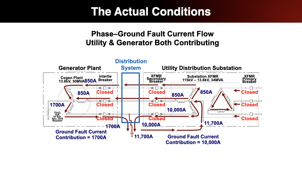 The fault current paths and magnitudes presented in this diagram represent a flawed analysis. During a ground fault in the distribution system, this diagram indicates the generator will supply only 10 A of fault current through its NGR, and the utility substation transformer will supply 10,000 A independently from the generator. In a multi-grounded neutral system the ground fault current does not necessarily return to its source through that source’s neutral terminal. The ground fault current path is impedance-dependent.